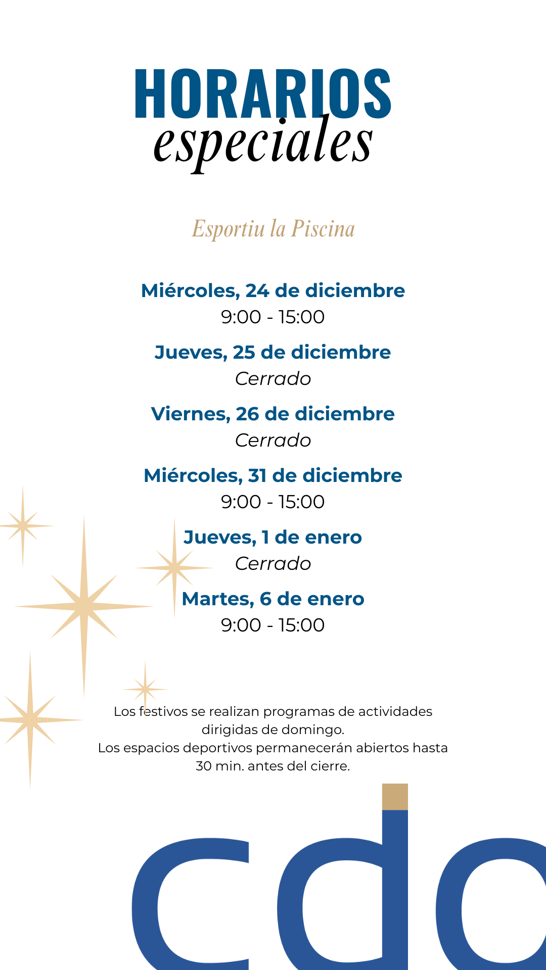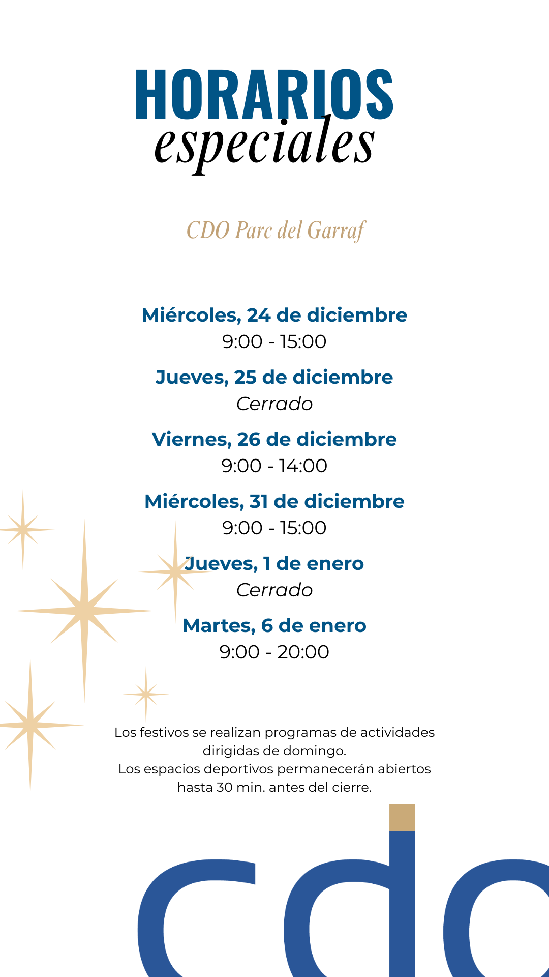 Durante estas fiestas queremos que sigas cuidándote y disfrutando del deporte, por eso hemos adaptado nuestros horarios para que puedas entrenar sin preocupaciones. Consulta a continuación los horarios especiales de nuestros centros para seguir en movimiento estas Navidades.